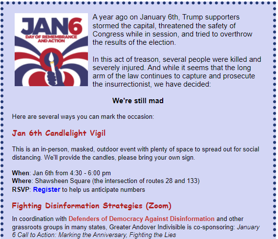 Join Greater Andover Indivisible for a January 6th Candlelight Vigil January 5, 2022 Julie Naughton RSVP here for the Candlelight Vigil Register here for Together – Re-districting Briefing Special Event Fighting Discrimination Strategies is already full. Share this: Share on X (Opens in new window) X Share on Facebook (Opens in new window) Facebook Like Loading... Related