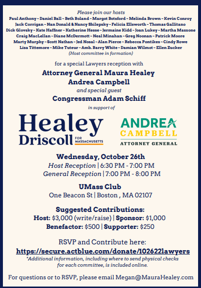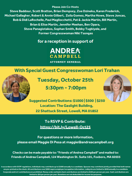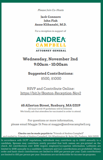 Democratic Attorney General candidate Andrea Campbell, endorsed by Maura Healey, needs our support. Below are upcoming candidate events.